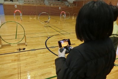 ドローンの飛ばし方を酒井先生にアドバイスしてもらいながら、徐々にコツをつかんでいました。