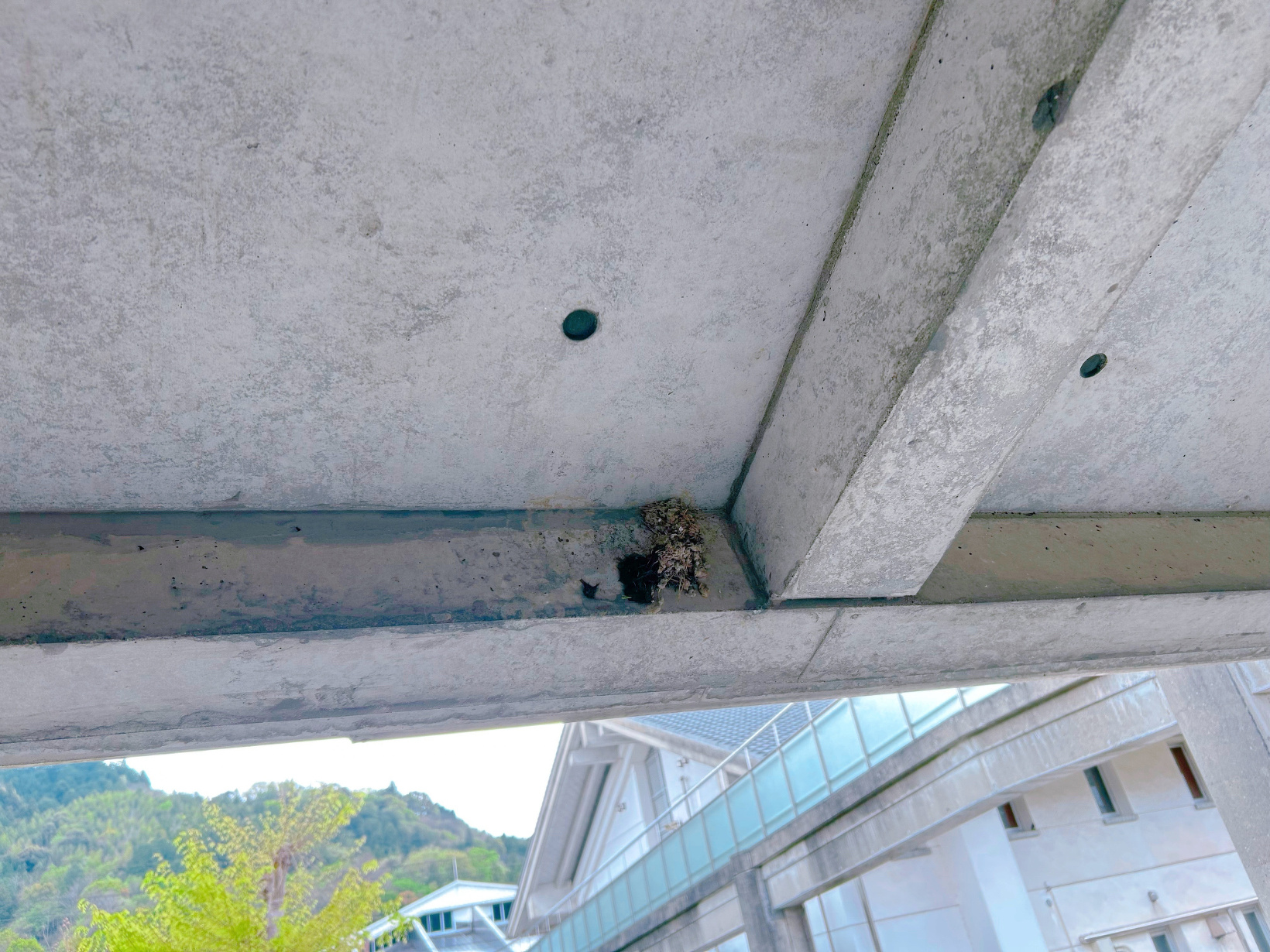 よくよく見てみると喫煙所の上にある大きな日差しのところに過去に作られた巣の跡がうっすらと残っていました。