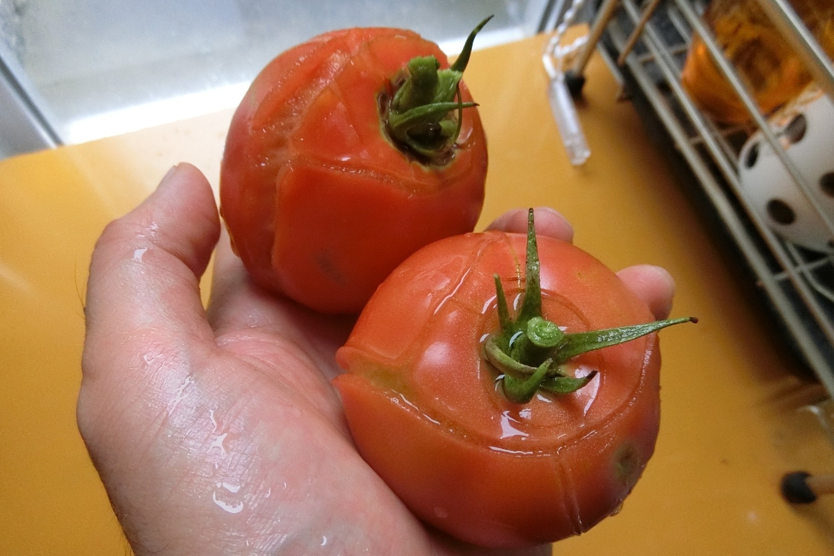 8月14日(土) こんにちは 本日も雨、湿度が高くジメジメとしたお天気ですね。 昨日の強い雨の影響で畑の様子をうかがっていると、大事に育てていたトマトが割れていました。 色づくのが遅く長い間熟れるのを待っていましたが、残念な結果になりました。 少し淡いですが、赤くなっているので美味しくいただきます。