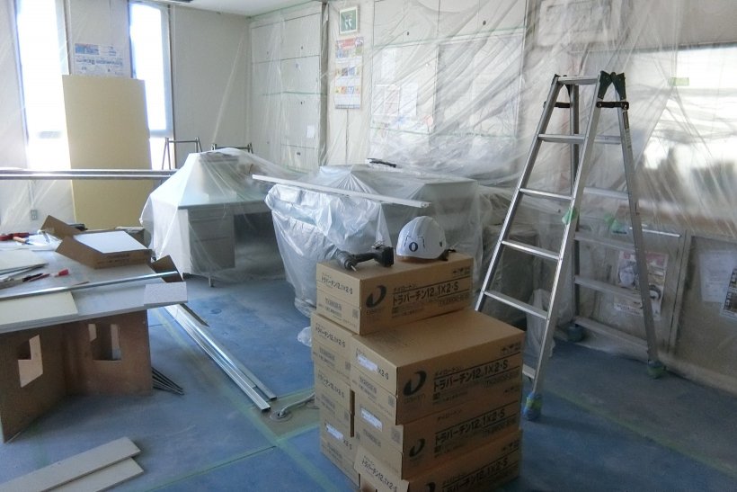 1月22日(土) こんにちは 今日の天気は晴れ、寒い日が続いています。(>_<) 本日の写真は工事中の事務所です。 持ち出せなかった机やロッカーなどは養生され、 床には青いシートが敷かれています。 こう見るといつもいる事務所と違って見えますね。(;・∀・) この事務所内の工事が終われば、和室の利用も可能になりますので、 あと少しご不便をおかけしますがよろしくお願いします。