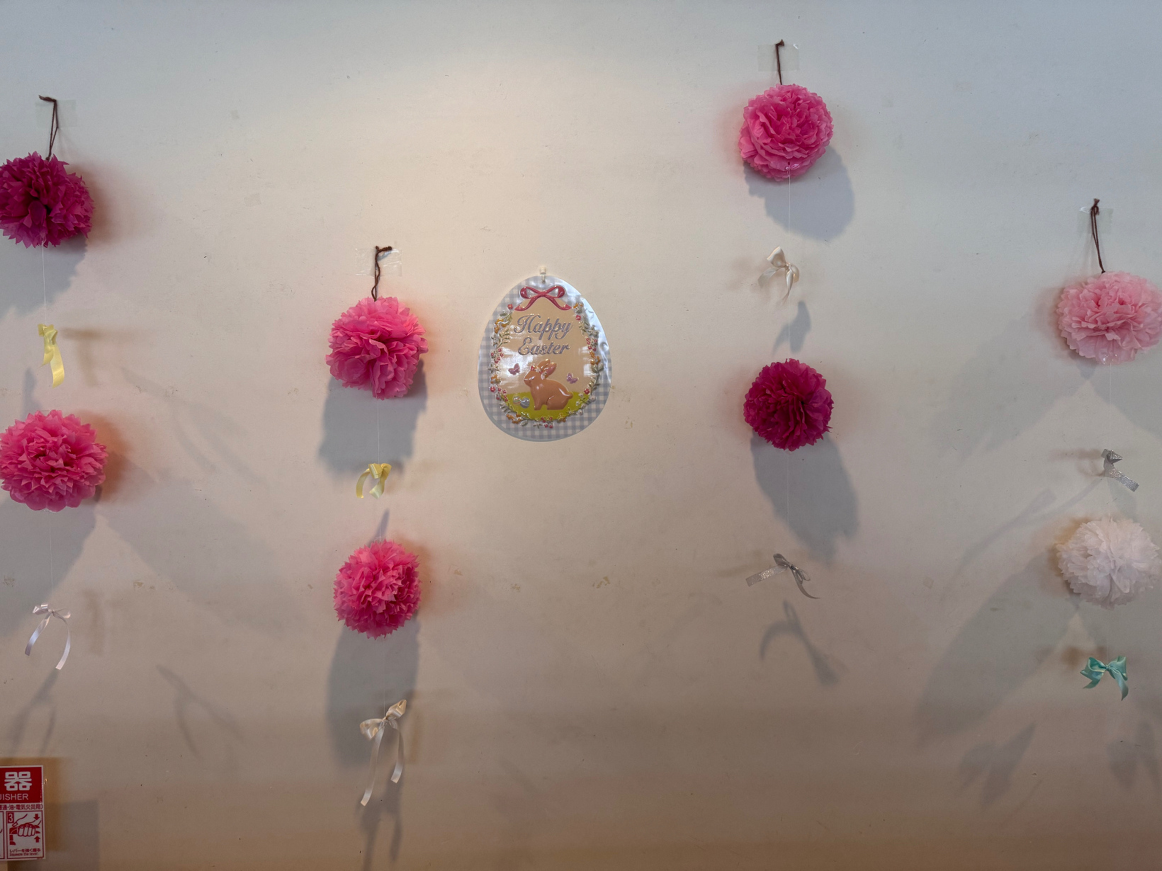 2026年04月03日(金) 令和7年 < 今日の青少年の家 NEW 3月30日(月) こんにちは! 今日は暖かく過ごしやすい1日となりそうですね(^^♪ 今日の1枚は2階の廊下飾りです!!! イースターラビットの絵葉書やイースターエッグの 次はプラスチック製のひっかけて飾るものです♪ 少し寂しいなと思い吊るしてみるとピンクのお花紙に囲まれて 春のお花畑にいるような可愛い空間になりました(*´▽`*) 心が癒され今日も仕事を頑張ろうと思います✿