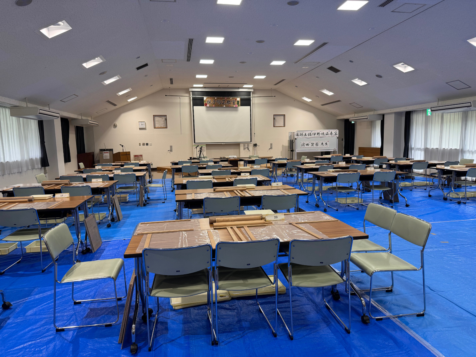 10月18日(土) こんにちは! 今日は明日開催される陶芸教室の準備日です!!! 開錠設営を職員でしていきます!まず机を1度すべて取り除き 粘土が作業していると下に落ちてしまうため 皆さんには土足で室内を移動してもらうので 大集会室内のみブルーシートを敷きます! みなさんが動きやすいように 机を配置したら机に道具や板を置いて... 作るものによっては使う型が色々あるので それを後ろに配置して準備完了しました(`・ω・´) 明日の教室がとても楽しみです♬