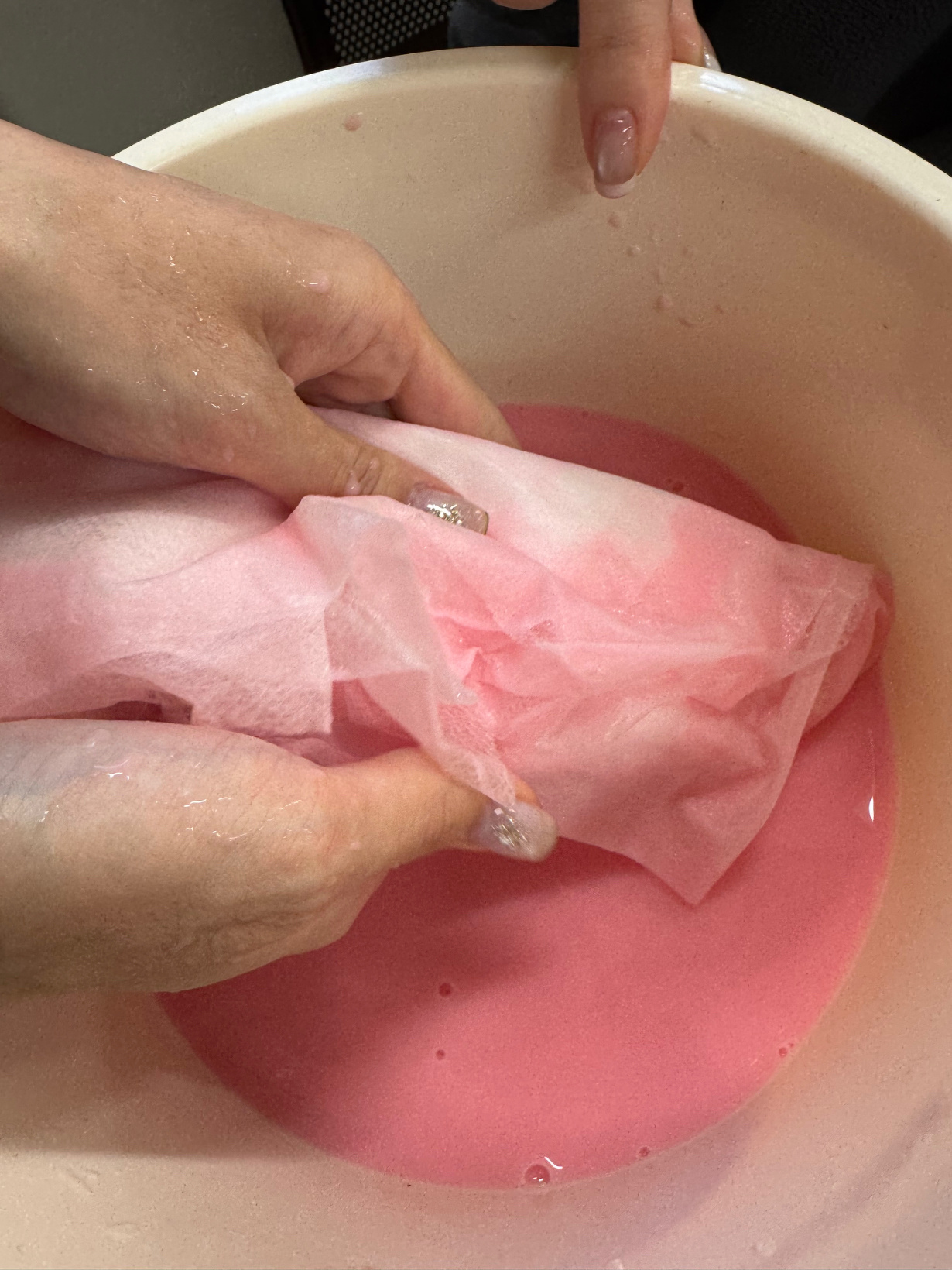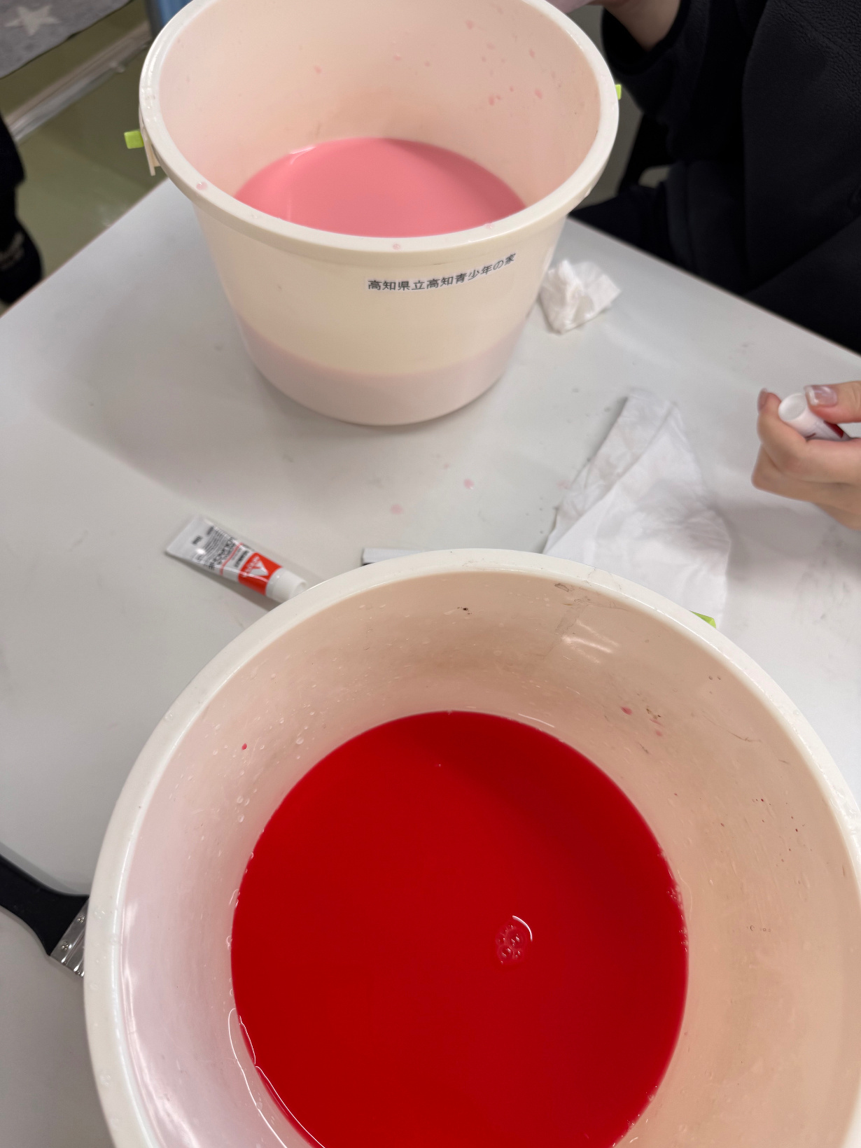 12月5日(金) こんにちは! 毎日寒い日が続き マフラーと手袋が必須の時期になりました:;(∩´﹏`∩);: 今日は今月開催される主催事業「親子キャンドル教室」の 飾りつけに使用する白い不織布を染める実験を行いました! 染料に使ったのはアクリル絵の具です☆ 一度目の実験ではピンク色を水に溶かしてみたのですが 紙が薄いためほとんど色が残らず… 二度目の実験で、赤色単品を使って染めると ほんのりピンク色に染まりました! これを使って大集会室を華やかにしていきたいと思います♩