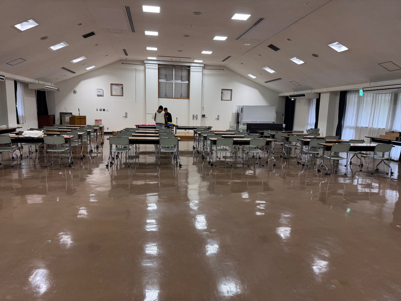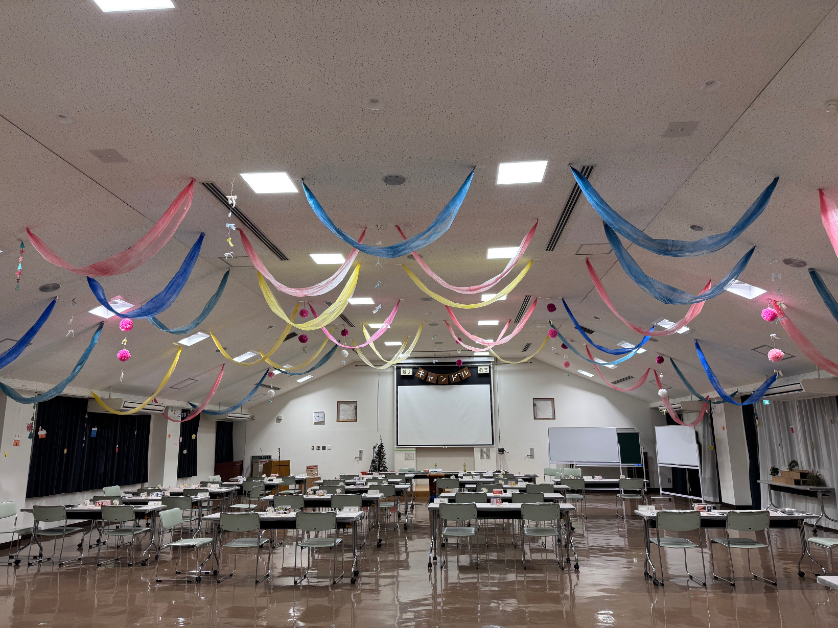 12月13日(土) こんにちは! 今日の写真は、キャンドル教室の会場が出来るまでの写真です! 参加家族分机を配置し、参加人数分椅子をおいていきます! それ以外は隅へ移動します(`・ω・´) 次はロウが机に引っ付くのを防ぐために不織布をかけ 必要なものを机の上へセッティング✿ 職員お手製の飾りを装飾しカーテンなどにも サンタさんたちを貼り付け キャンドル教室は最後にみなさんの作品を撮影するので 写真スポットも設置したら準備完了です(`・ω・´) 明日の教室を無事迎えられそうで一安心です☆