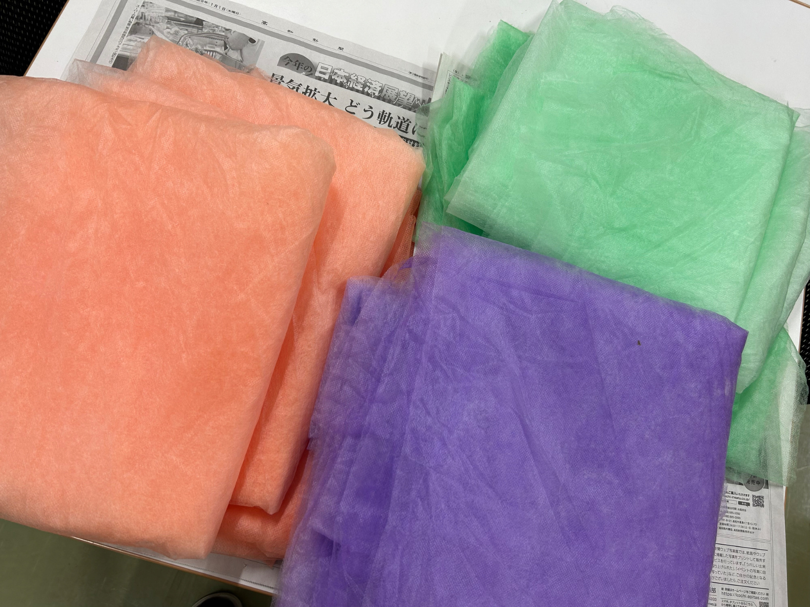 1月17日(土) こんにちは! 昨日ご紹介した不織布の色染めの続きをご紹介します❀ 半日浸けておいたものをしぼって 乾かすとこのような仕上がりになりました♩ 真っ白だった不織布が綺麗な色に仕上がりました。 前回の3色と合わせると、とてもカラフルで 天井が色鮮やかになってくれると思います☆