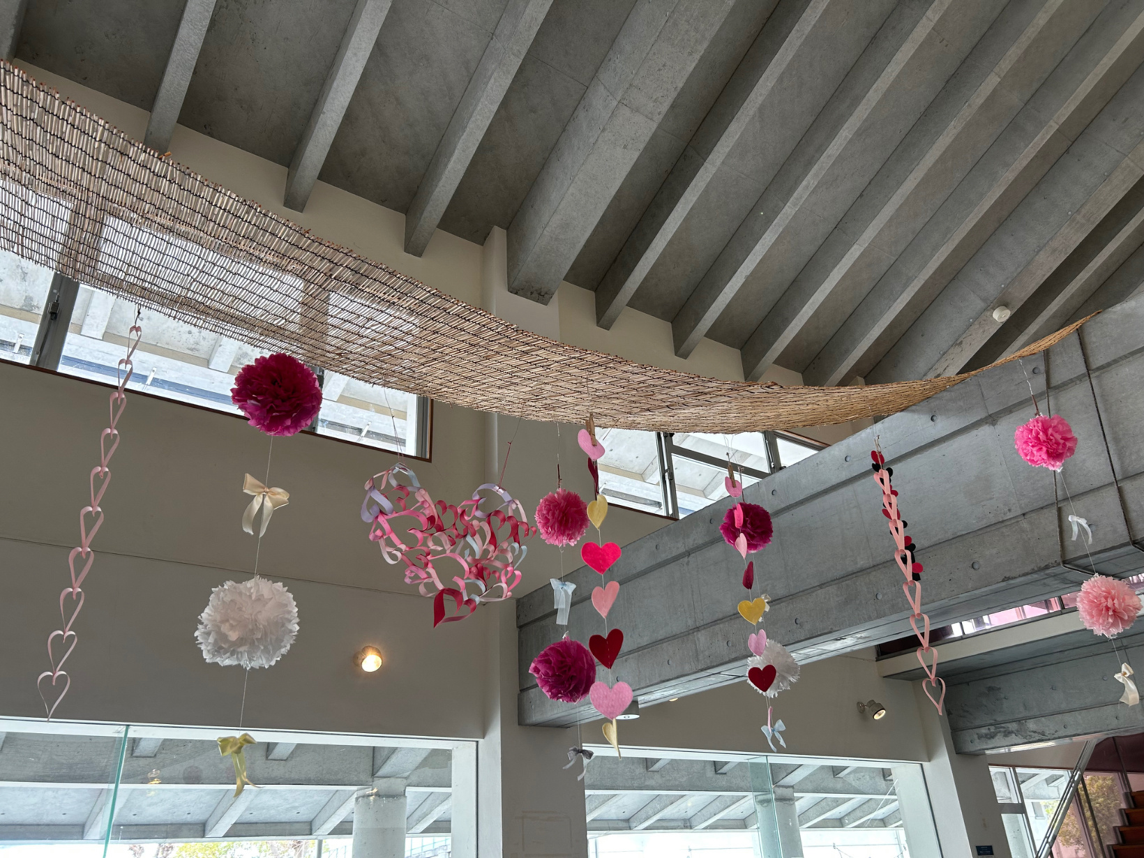 2月11日(水) こんにちは! 今日は建国記念の日で祝日ですが、 青少年の家は元気に開館しています♩ 今日はロビーの季節の飾りを新たに作りました! フェルトや画用紙、折り紙といった様々な素材を用いて ハートがモチーフの吊るし飾りを増やしました。 ピンクや赤を多く使ったため 一気にラブリーな雰囲気のロビーになりました♡