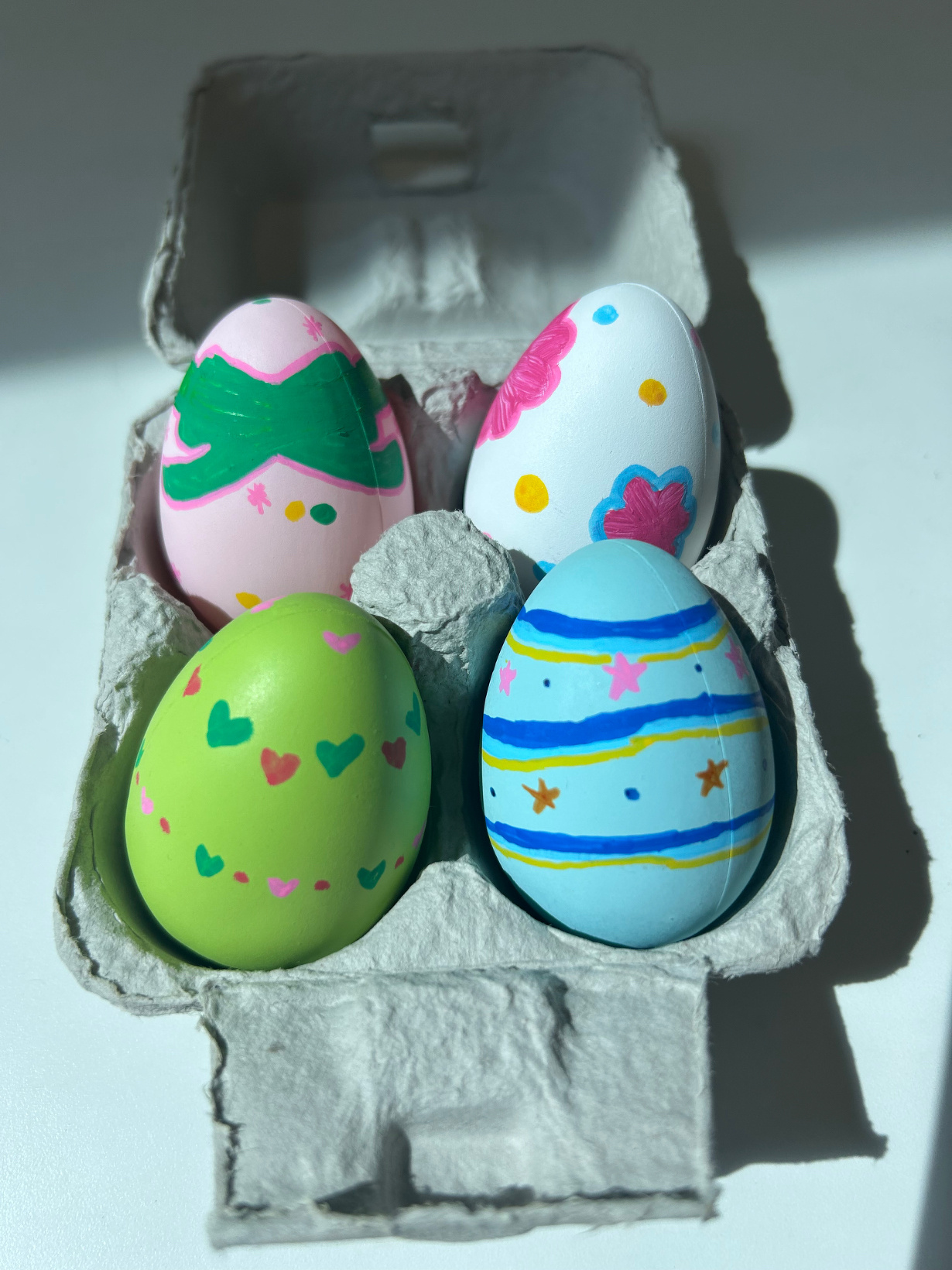 3月16日(月) こんにちは! 今日は先日掲載したイースターエッグに柄を描きました❀ 始めは絵の具で描こうと試みたのですが 卵形のため、絵の具が手に付いたり 手の色が卵に移ったりと大変難しく… 絵の具は諦め、気を付けながらマーカーで描きました! 卵に絵を描くのは初めてのことだったので 少々いびつな絵になってしまいましたが可愛い花などが加わり 明るいイースターエッグになったのではないかと思います♩
